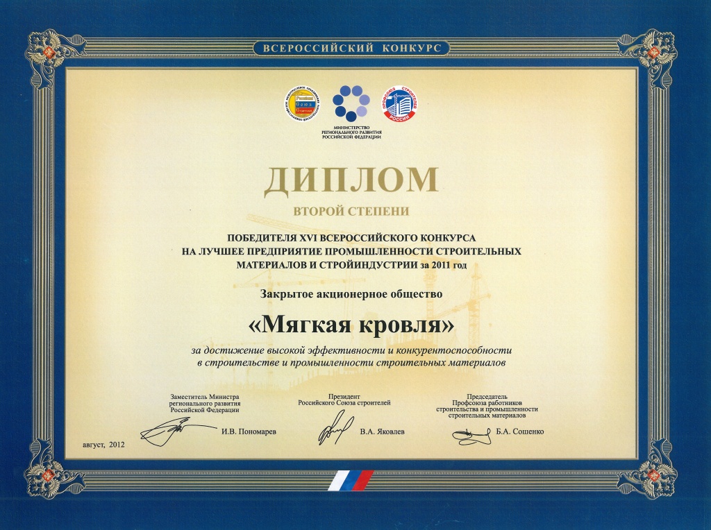 Завод «Мягкая кровля» вошел в число 70 лучших предприятий строительных материалов и стройиндустрии за 2011 год по итогам XVI Всероссийского конкурса на лучшую строительную организацию, предприятие строительных материалов и стройиндустрии.